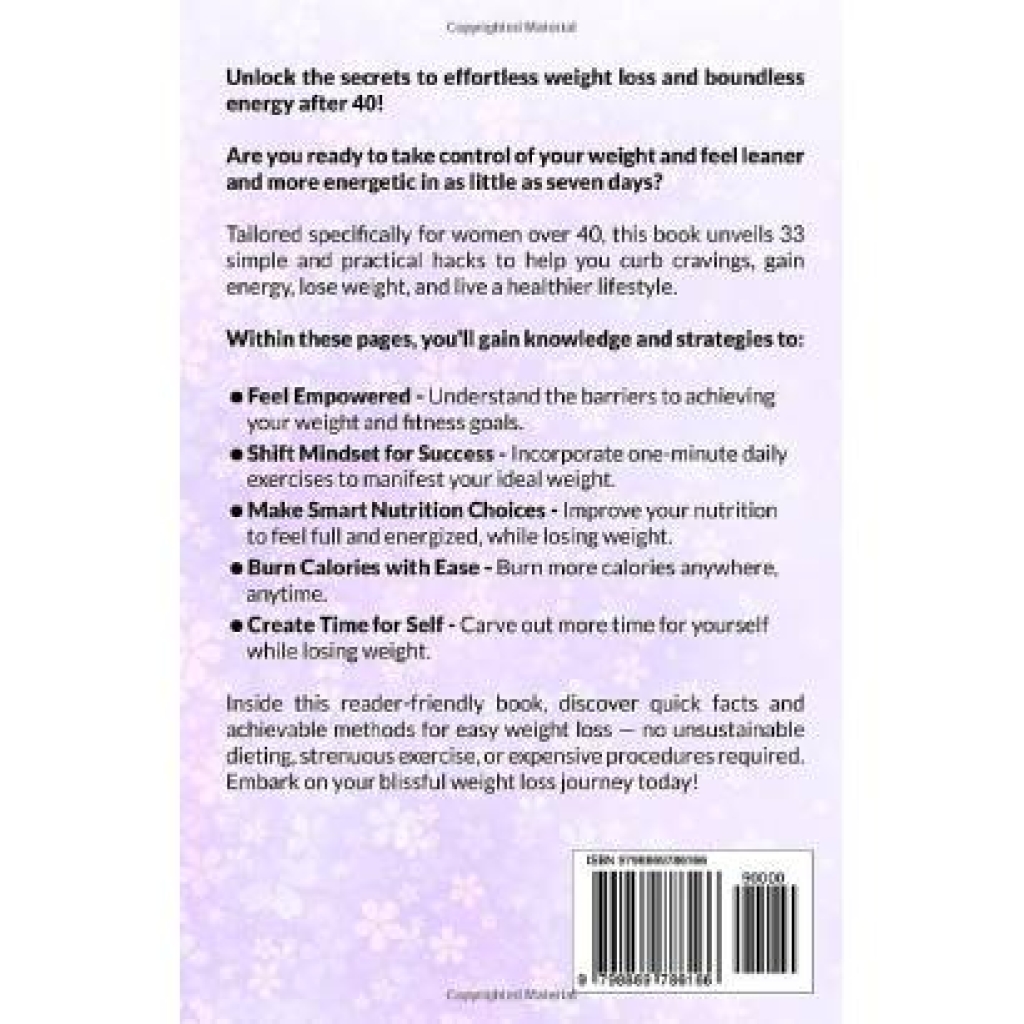 “Sensible Weight-Loss Advice! This is a really good book offering sensible advice on strategies to lose weight and improve your health. The author begins by giving an overview of why we often gain weight after the age of forty. Once that is established she begins giving ideas on ways to start making healthy habits that will aid in weight loss. I found this book to be informative. I believe that if one uses the suggestions outlined in the book it will most definitely help in improving weight loss goals and obtaining better health.”